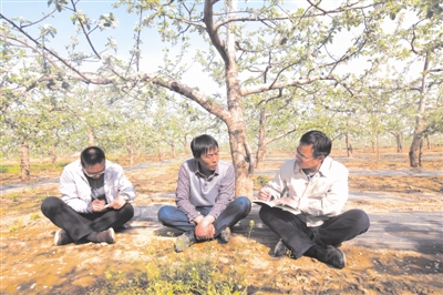 圖為馮振東(右一)深入基層調(diào)研蘋果產(chǎn)業(yè)。