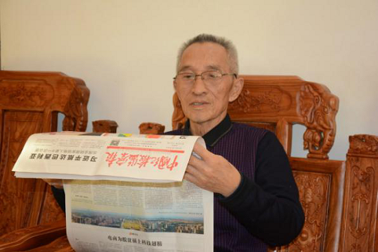圖為王日新在家中閱讀《中國紀檢監察報》。林偉彬 攝