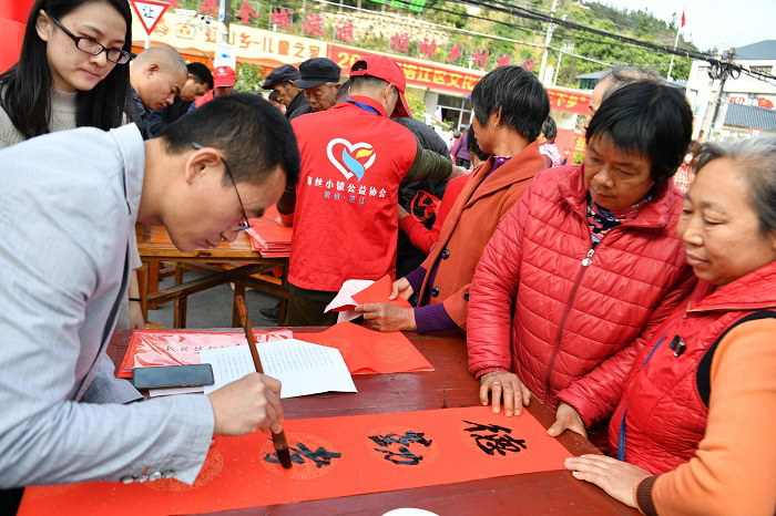 圖為洛江區(qū)書法名家在虹山鄉(xiāng)為群眾書寫孝廉家風(fēng)春聯(lián)。