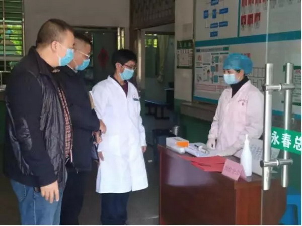 圖為1月31日,駐縣衛健局紀檢監察組檢查石鼓衛生院的物資儲備、門診預檢分診等情況。(林桂珠 攝 )