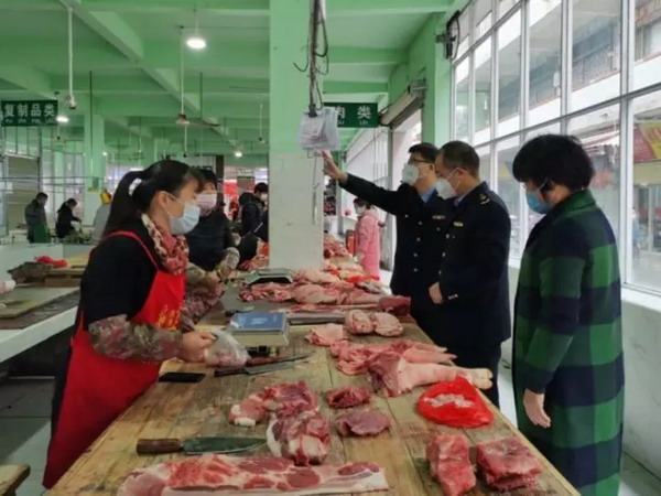 圖為2月4日,駐縣人大機關紀檢監察組聯合市場監督管理所執法人員到菜市場檢查“兩章兩證”及豬肉價格、供應情況。(許陽洋 攝)