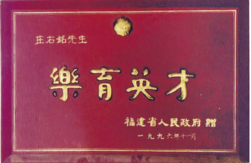 莊右銘傾注教育、情系桑梓。他不僅在新加坡倡設莊氏公會和惠安公會獎學基金會,為推廣海外華文教育做出了巨大貢獻,更不忘造福家鄉——捐建泉港一中“和熹堂”、山腰中心小學萃照教學樓、濤聲館、電教室,助建泉港二中旅星教學樓,捐助泉州黎明大學等,捐資金額逾四百多萬元人民幣,獲福建省人民政府表彰。