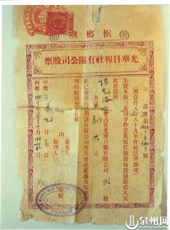 為最大力度支持革命宣傳工作,1910年莊銀安等人在檳榔嶼創辦了《光華日報》,陳允洛個人曾出資購買了該報股票。陳世友至今仍留存著祖父所持有的《光華日報》股票,他說:“祖父陳允洛為該報股票持有人之一,數額為二股。”