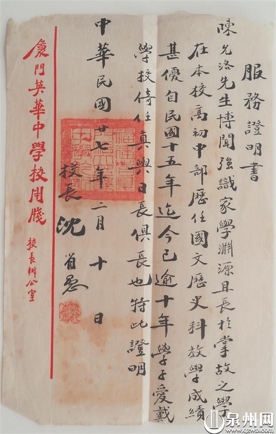 早年參加同盟會以及在益商學校任教的經歷,讓陳允洛抱定了“教育為立國之基” 的宗旨。他孜孜不倦地傳播真理,啟迪民智,為國家、民族培養人才。1920年,陳允洛在仰光創辦平民學校,從1925年開始,陳允洛便回廈門鼓浪嶼英華中學教書并任國文主任,總共在英華中學執教了14年。1938年,廈門即將遭日軍占據,陳允洛還鼓勵學生效法民族英雄起來抗爭。