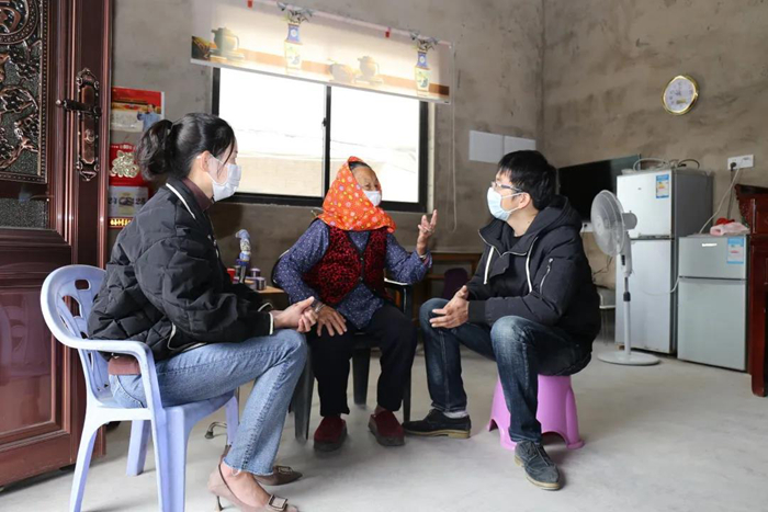 惠安縣紀委監委干部、凈峰鎮洋邊村駐村第一書記汪澤翔(右一)與王奶奶拉家常(張琦敏 攝)