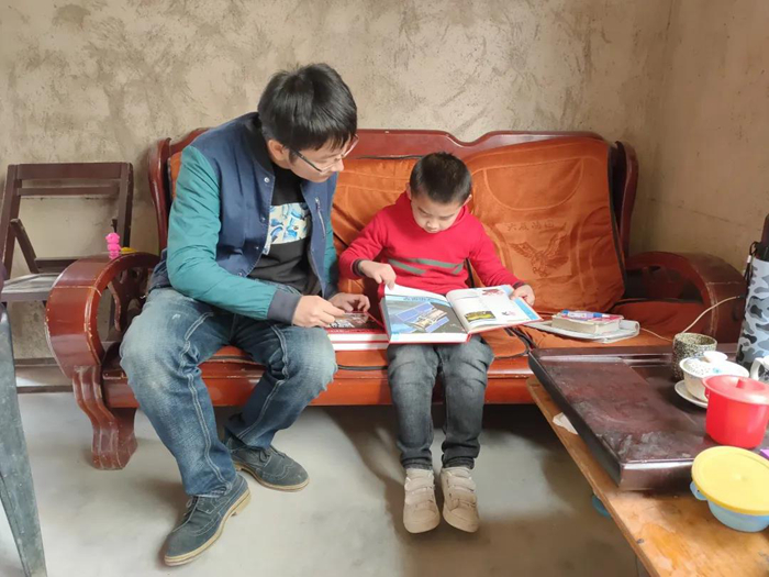 王奶奶孫子在“小汪叔叔”的指導下,專注地閱讀書籍(張琦敏 攝)