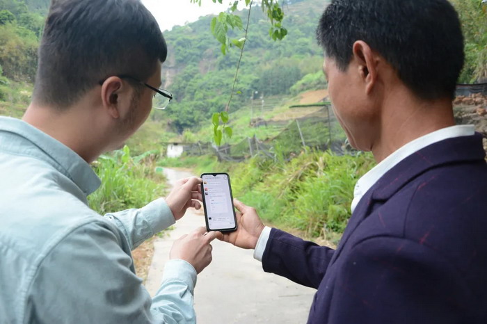 圖為陳榮桂指導(dǎo)貧困戶老楊用微信群推銷河田雞(林偉彬 攝)