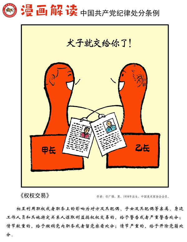 編者按:紀(jì)律是我們黨的生命線,加強(qiáng)紀(jì)律建設(shè)是全面從嚴(yán)治黨的治本之策。為深入貫徹落實(shí)十九屆中央紀(jì)委四次全會(huì)關(guān)于加強(qiáng)黨紀(jì)國(guó)法教育的部署要求,強(qiáng)化黨規(guī)黨紀(jì)的學(xué)習(xí)宣傳、貫徹執(zhí)行,使鐵的紀(jì)律真正轉(zhuǎn)化為黨員干部的日常習(xí)慣和自覺(jué)遵循,中央紀(jì)委國(guó)家監(jiān)委網(wǎng)站聯(lián)合河北省紀(jì)委監(jiān)委,以漫畫(huà)形式對(duì)《中國(guó)共產(chǎn)黨紀(jì)律處分條例》進(jìn)行解讀,陸續(xù)連載刊發(fā),敬請(qǐng)關(guān)注。