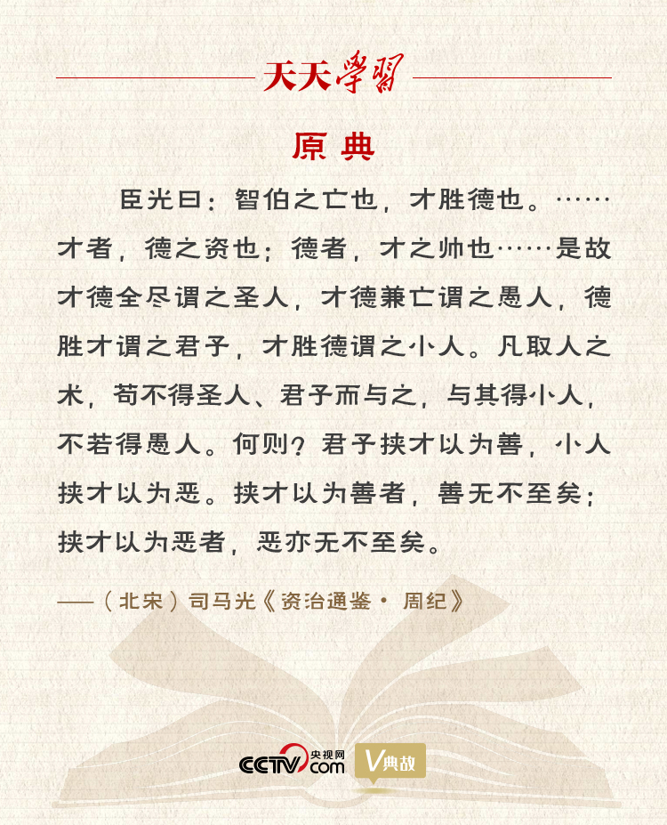 《資治通鑒》記載了中國歷史上一次非常慘痛的用人教訓,春秋末年晉國大夫智宣子錯誤地選擇了多才少德的智伯為繼承人,結果導致強大的智氏家族遭致滅族之禍。為此,北宋史學家司馬光評論道:“智伯之亡也,才勝德也。”并提出“才者,德之資也;德者,才之帥也”的著名論斷,意思是才能是德行的憑借,德行是才能的統帥。