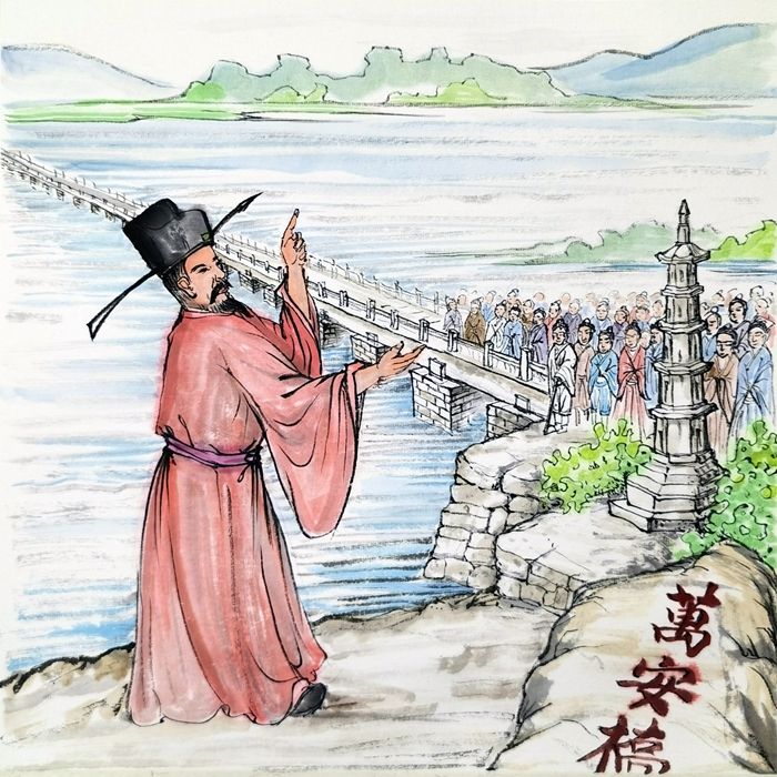 為了免去百姓渡江危險,蔡襄將因技術難題和資金不足而停工的萬安橋復工擺上議事日程。一方面他深入現場調研,集思廣益,運用“種蠣固基法”,解決技術問題;另一方面在其母親支持下,把家中僅有的地田“捐出一百六十石助役”為建橋籌措經費。在蔡襄率眾努力下,1059年我國第一座跨海巨型石梁橋——萬安橋(今洛陽橋)訖工。