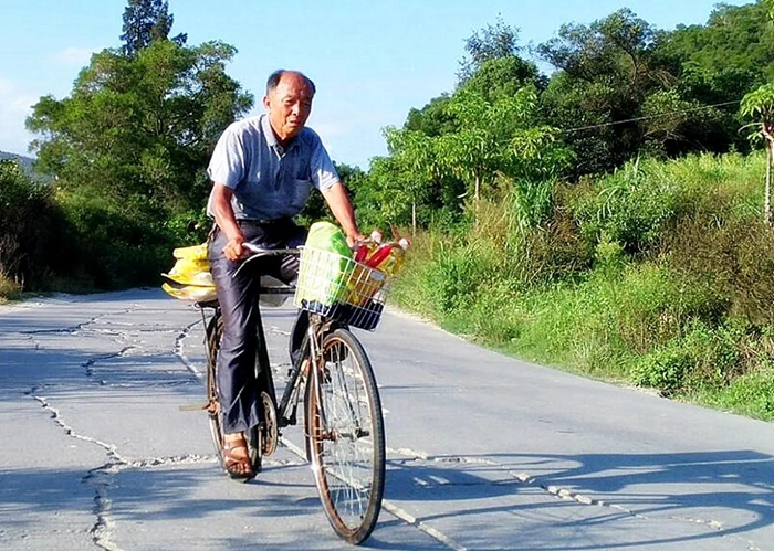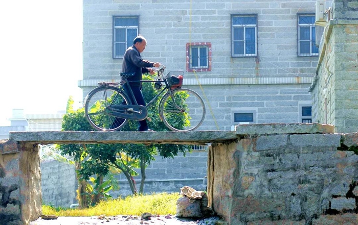 陳欠水推著自行車經過鄉間小橋