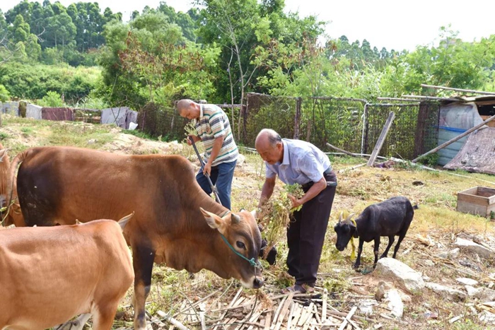 陳欠水(右)與幫扶對象一起喂牛羊