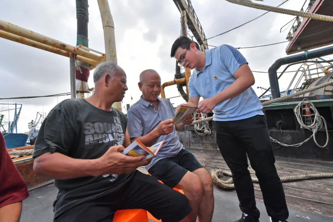 泉港區(qū)峰尾鎮(zhèn)紀(jì)檢監(jiān)察干部踏上碼頭、登上漁船,向海上漁民普及換屆紀(jì)律要求,提升黨員群眾對嚴(yán)肅換屆紀(jì)律工作的知曉率、支持率和參與率。(林弘梫 攝)