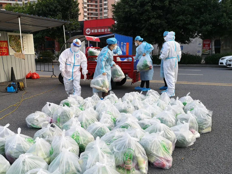 除了防疫物資,生活物資保障充足才能讓群眾安心居家。疫情初期,為了緩解封控區(qū)群眾沒(méi)有儲(chǔ)備糧食的困境,我們迅速協(xié)調(diào)捐贈(zèng)了一批面包、小蛋糕等應(yīng)急食品,連夜分裝打包送到村民家中。后又經(jīng)多方聯(lián)系,我最終找到一家蔬菜配送公司愿意為小區(qū)不間斷供應(yīng)食材、配送上門,及時(shí)幫助解決群眾生活所需。