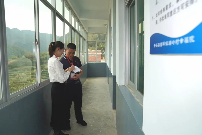 謝杰峰(右)實地測量湖嶺村村部墻壁的粉刷面積