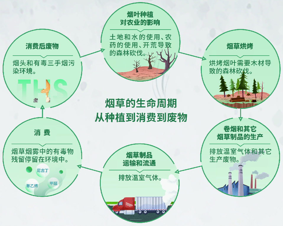 煙草使用不僅直接影響人們的身體健康,更是持續威脅著我們的生存環境。煙草對環境的損害,遠遠不限于煙草煙霧釋放到空氣中所帶來的影響。煙草整個生命周期都是一個極其污染和嚴重破壞環境的過程。