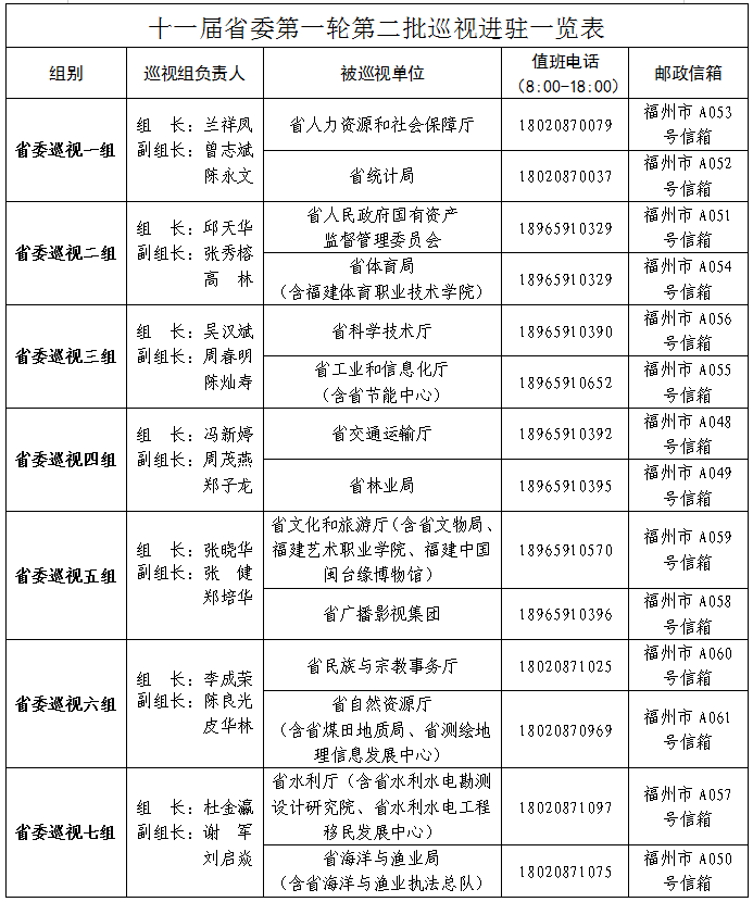 根據《中國共產黨巡視工作條例》及中央、省委關于巡視工作的部署要求,經省委巡視工作領導小組同意,省委巡視組近期陸續進駐,對省科學技術廳、省工業和信息化廳(含省節能中心)、省民族與宗教事務廳、省人力資源和社會保障廳、省自然資源廳(含省煤田地質局、省測繪地理信息發展中心)、省交通運輸廳、省水利廳(含省水利水電勘測設計研究院、省水利水電工程移民發展中心)、省文化和旅游廳(含省文物局、福建藝術職業學院、福建中國閩臺緣博物館)、省人民政府國有資產監督管理委員會、省林業局、省海洋與漁業局(含省海洋與漁業執法總隊)、省體育局(含福建體育職業技術學院)、省統計局、省廣播影視集團等14個省直單位黨組織開展常規巡視,巡視時間40天左右。