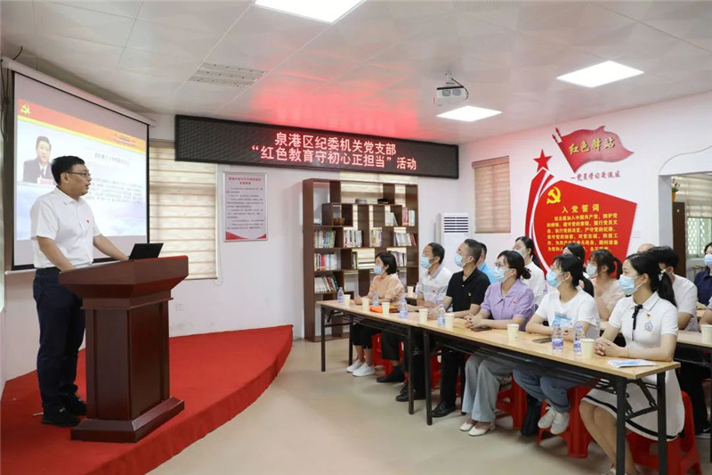 泉港區(qū)紀委監(jiān)委機關黨支部組織開展以“紅色教育守初心正擔當”為主題的“七一”黨日活動,通過黨支部書記上黨課、紅書閱讀沙龍、參觀基層黨建館等活動,引導紀檢監(jiān)察干部賡續(xù)紅色精神命脈、汲取砥礪前行力量。(連微 攝)