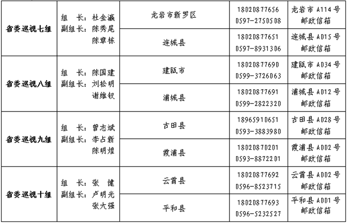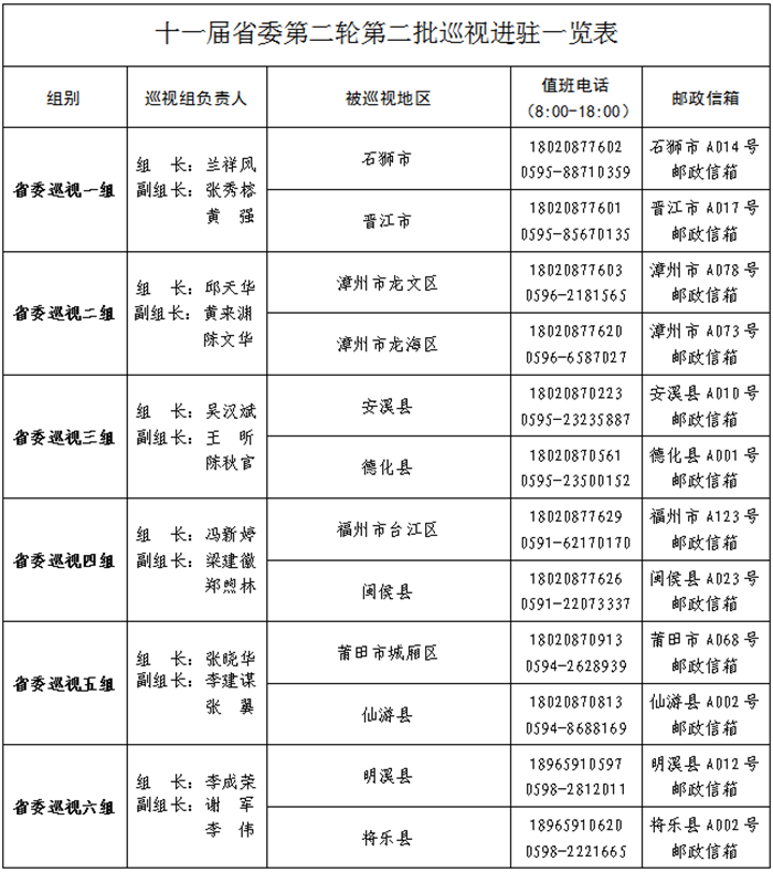 根據(jù)《中國共產(chǎn)黨巡視工作條例》及省委《實施辦法》規(guī)定,經(jīng)省委同意,省委巡視組近期陸續(xù)進(jìn)駐,對福州市臺江區(qū)、閩侯縣,漳州市龍文區(qū)、龍海區(qū)、云霄縣、平和縣,石獅市、晉江市、安溪縣、德化縣,明溪縣、將樂縣,莆田市城廂區(qū)、仙游縣,建甌市、浦城縣,龍巖市新羅區(qū)、連城縣,古田縣、霞浦縣等20個縣(市、區(qū))開展巡視,巡視時間40天左右。