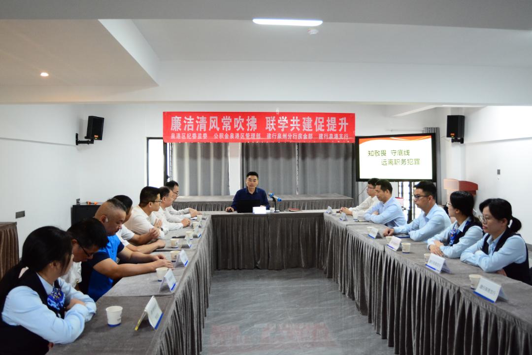 泉港區(qū)紀委監(jiān)委聯(lián)合中國建設銀行泉港支行、前黃鎮(zhèn)紀委監(jiān)察組,開展“廉潔清風常吹拂 聯(lián)學共建促提升”廉政教育系列活動,推進金融領域黨風廉政建設,涵養(yǎng)行業(yè)廉潔新風,助力優(yōu)化營商環(huán)境。圖為該區(qū)紀委監(jiān)委第一紀檢監(jiān)察室主任吳航標作《知敬畏 守底線 遠離職務犯罪》廉政主題報告。(鄭鑒強 攝)
