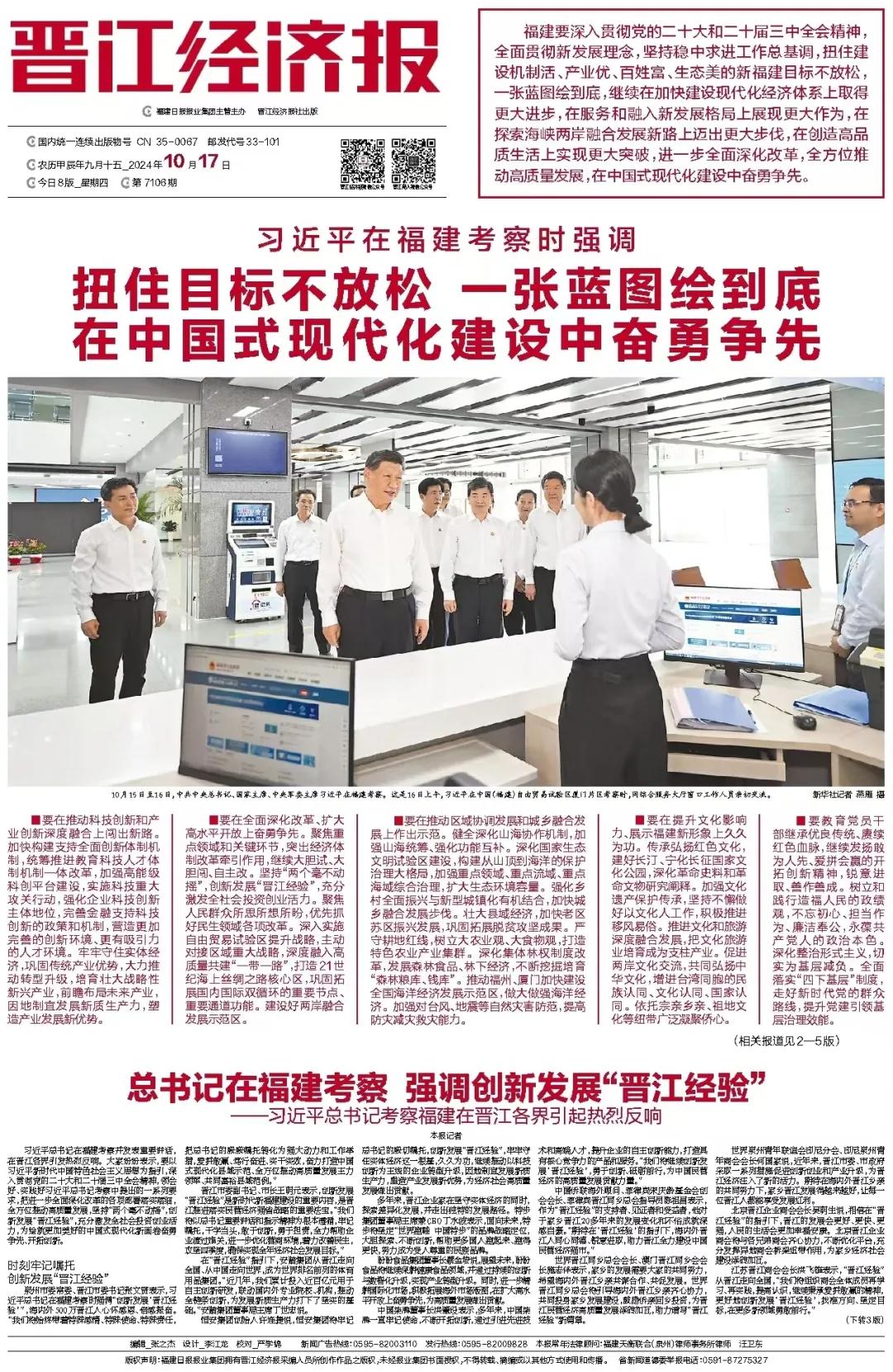 10月17日《新福建》客戶端刊發《總書記在福建考察強調創新發展“晉江經驗”——習近平總書記考察福建在晉江各界引起熱烈反響》全文如下
