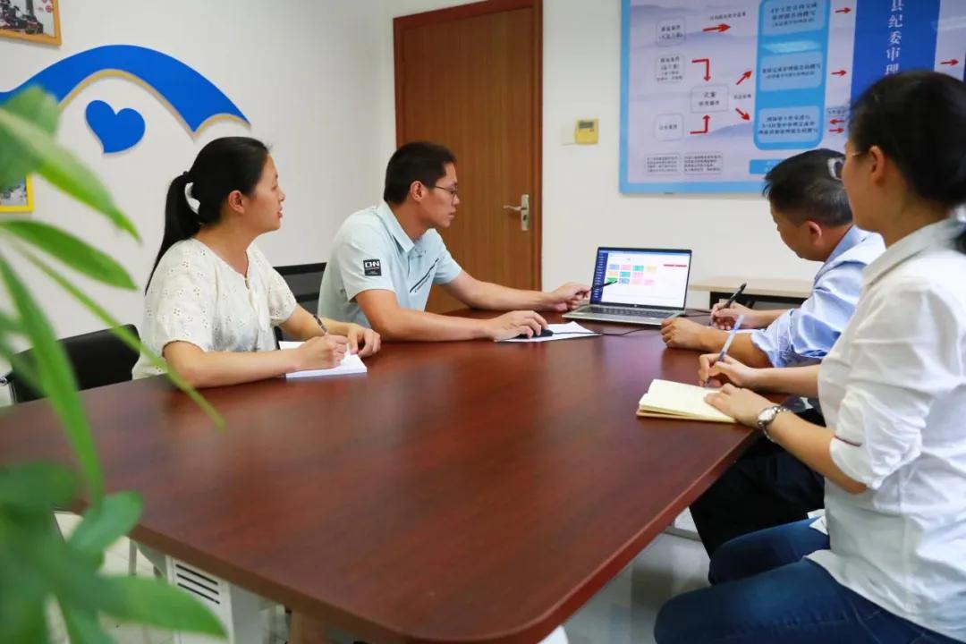 該縣紀(jì)檢監(jiān)察干部利用基層小微權(quán)力監(jiān)督平臺對相關(guān)問題進行分析研討(林俊賢 攝)