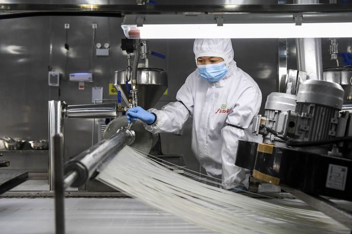 在廣西柳州市一家螺螄粉生產企業,工作人員在查看米粉的生產情況(2024年12月13日攝)。新華社記者 曹祎銘 攝