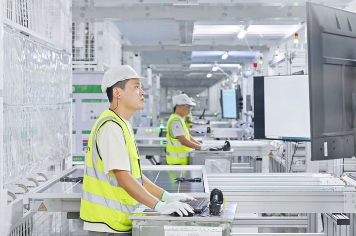 工人在位于浙江省樂清市的正泰集團8GW高效光伏組件生產基地工作(資料照片)。新華社發