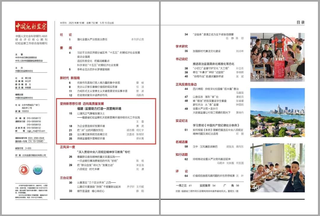 《中國紀檢監察》雜志2025年第10期共刊發7篇系列文章,12個頁碼的篇幅全面系統深入報道福建省紀檢監察機關監督助力打造一流營商環境的做法和成效,敬請關注第二篇報道