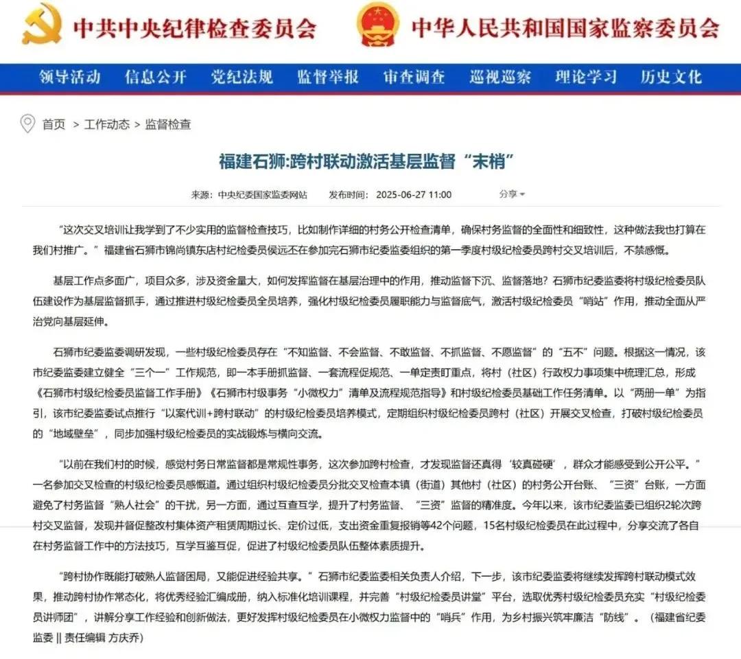 6月27日中央紀委國家監委網站報道《福建石獅:跨村聯動激活基層監督“末梢”》