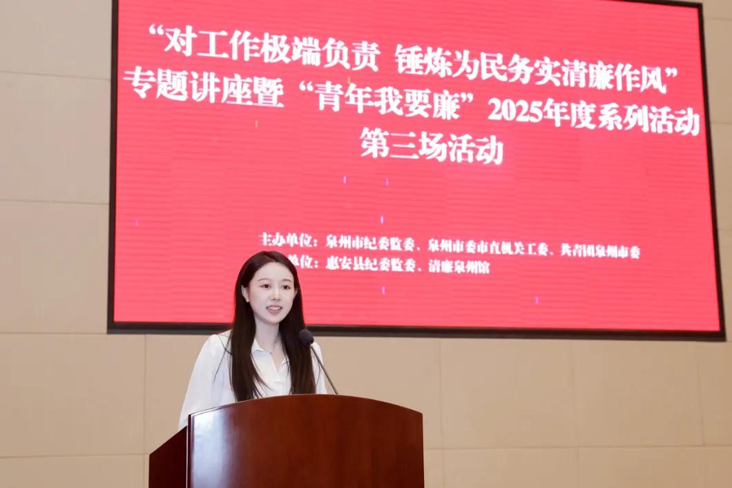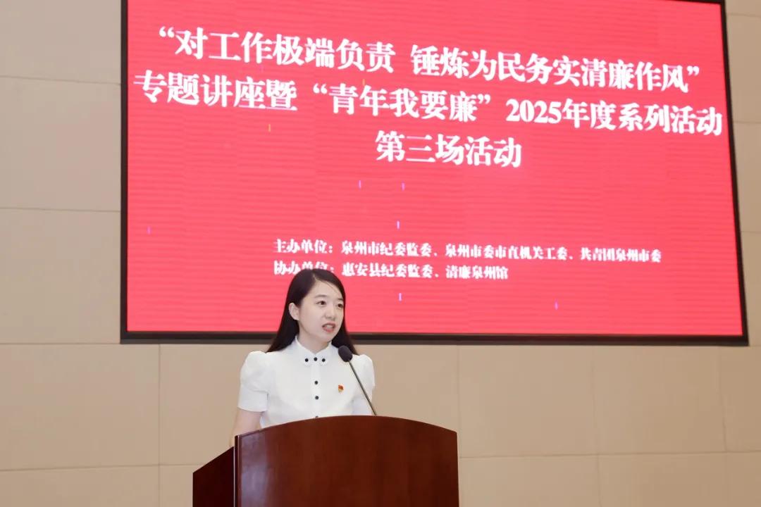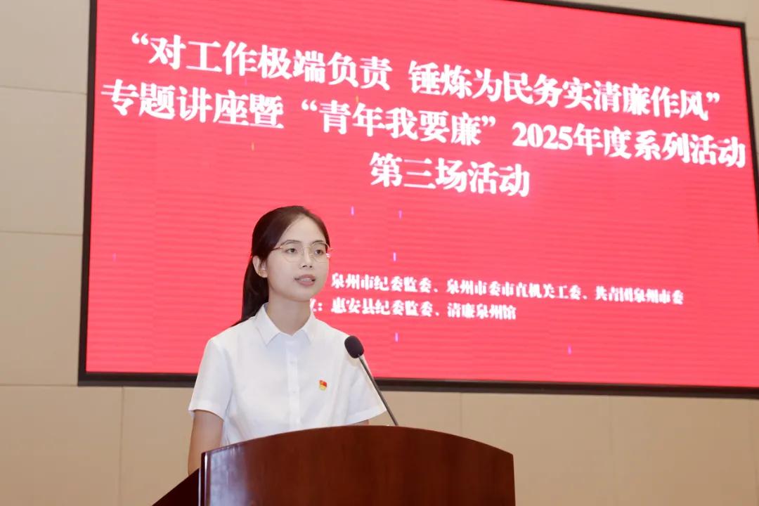 7月25日,由市紀委監委、市委市直機關工委、團市委主辦,惠安縣紀委監委、清廉泉州館協辦的“對工作極端負責 錘煉為民務實清廉作風”專題講座,暨“青年我要廉”2025年度系列活動第三場活動舉辦,邀請全國優秀共產黨員、惠安縣人大常委會原助理調研員陳欠水分享濟困助殘的生動故事。來自市直各單位、省部屬駐泉單位、惠安縣和“青廉風采崗”展示單位的200多名青年干部參加活動。